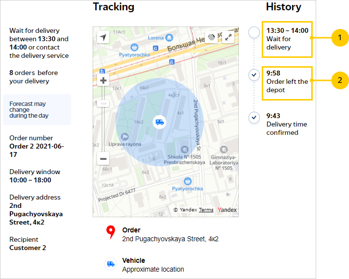 The delivered order widget displays the order and recipient data and the tracking history with significant route points.