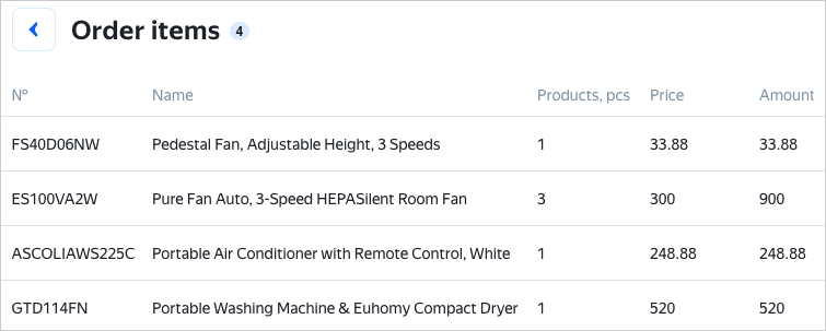 By default, the order items table displays all items.