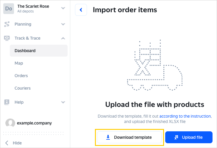 To upload order items, use an Excel file filled out using this template.