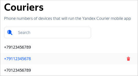 In this section, you can add the phone numbers of couriers who need to use the Yandex Courier app.