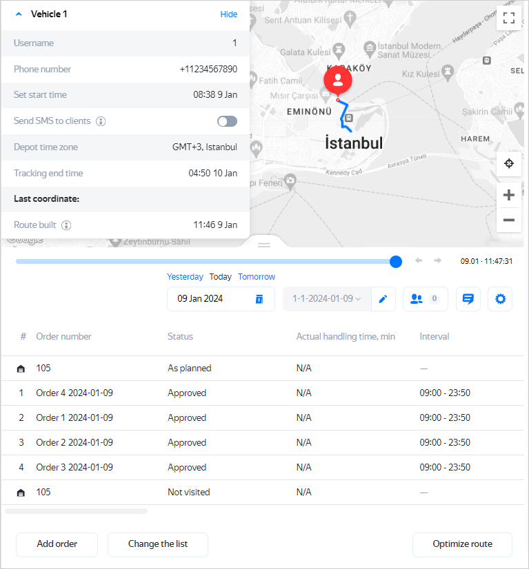 The blue slider under the map is active when a route has been started and after it is completed. By moving the slider, you can view the courier's location at different points in time. The exact time is displayed to the right of the slider.