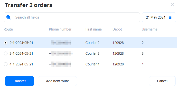 You can transfer orders from one route to another if the courier can't complete all of their orders (for example, if their car broke down or there was a long wait at a pickup location).