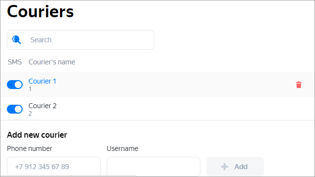 For each courier, you can enable or disable SMS notifications to customers about the status of their delivery. To do this, set the switch next to the courier's name to the desired position.