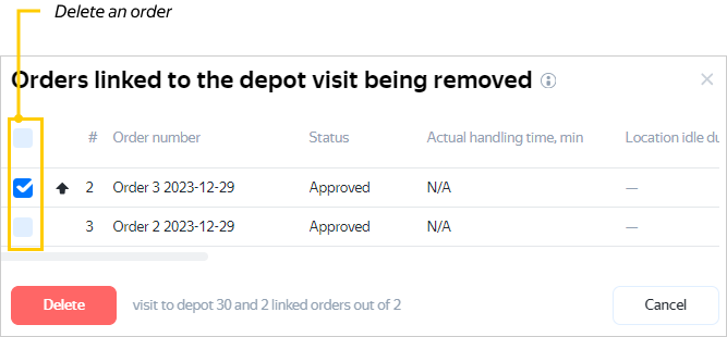 When you delete a stop at an intermediate depot, you're given the option to also delete orders assigned to that stop. You can delete part of the orders (by deselecting them) and leave others if you know that the remaining orders should be in this route.