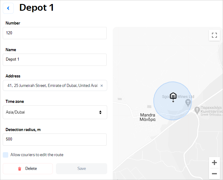 The exact address of the depot. Based on the address, the system calculates the coordinates of the route starting point.
