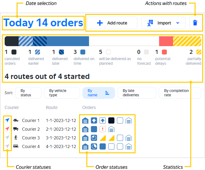You can sort the list of couriers in ascending or descending order by name, delays, and percentage of completed orders.