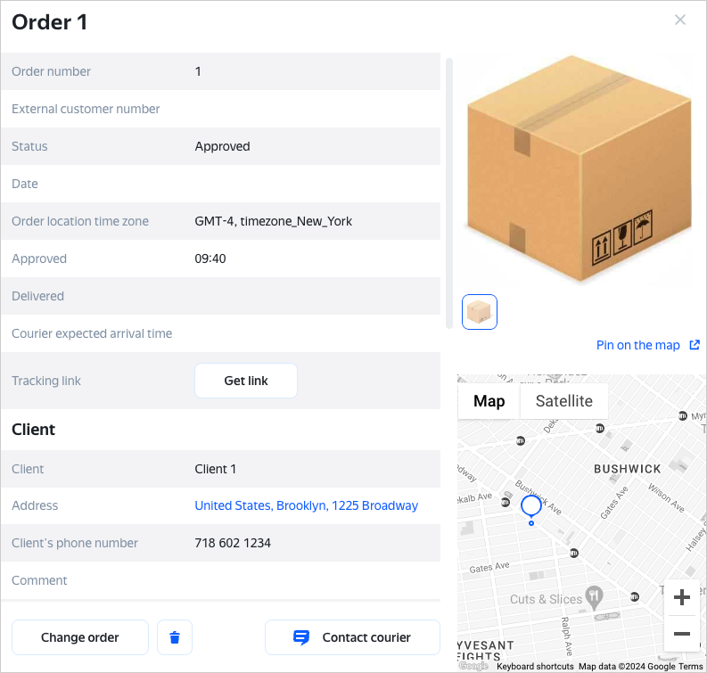 Order address (if explicitly specified). Click the link to go to Yandex Maps.