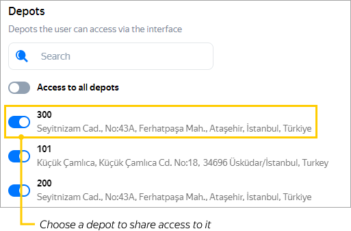 When you assign the Manager or Dispatcher role to a user, specify which depots and companies they should have access to. To do this, select the required options in the Depots section. The employee will get access to routes that start from the chosen depots.