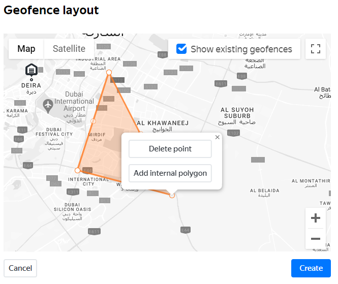 - To view previously created geofences on the map, choose Show existing geofences in the upper-right corner.
