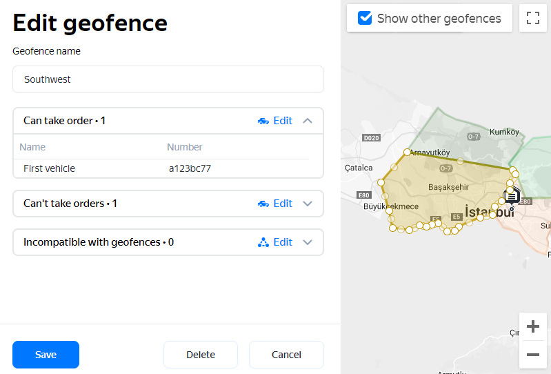 - You can use geofences to set payment rates for couriers. For example, orders within the city should be distributed to your own couriers and orders outside the city to third-party couriers, or vice versa.
