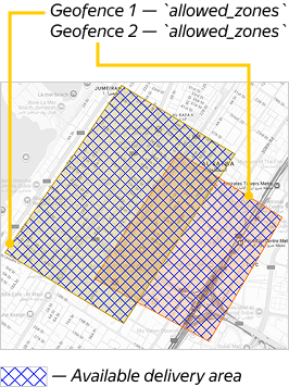 The vehicle can deliver orders in any geofences, including where they overlap Permitted delivery zone