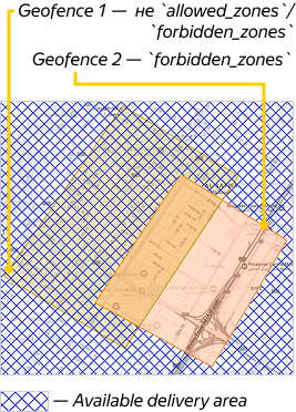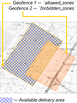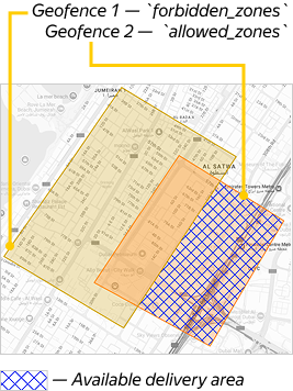 The vehicle can't deliver orders in any of these geofences or where they overlap Permitted delivery zone