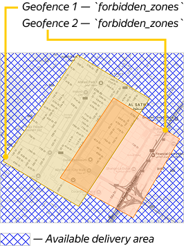 If the delivery location is where geofences overlap, there may be multiple delivery scenarios. Note that the Forbidden geofences field values (vehicle.forbidden_zones) take priority over Allowed geofences field values (vehicle.allowed_zones).