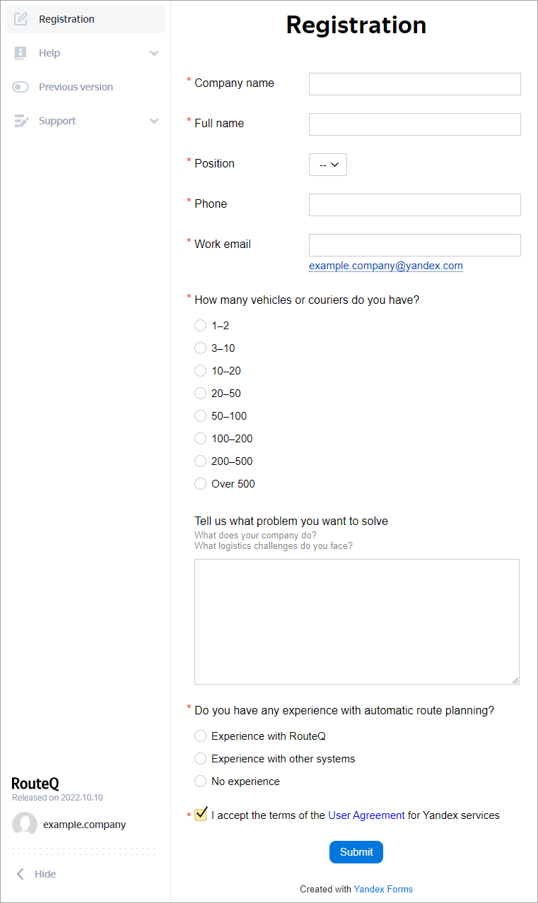 Click Submit. We'll contact you shortly to confirm your company's registration and provide you with trial access to RouteQ.